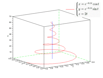 Пример асимптоты для кривой в пространстве. Спираль бесконечно приближается к прямой