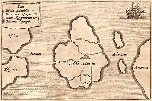 После кончины Фрэнсиса Бэкона был опубликован его неоконченный текст «Новая Атлантида» (1627). По жанру это утопия, автор-рассказчик которой, путешествуя по Южному морю из Перу в Китай, попадает на остров Бенсалем, где существует сообщество учёных, «нечто вроде Александрийского музея». По мнению П. Видаля-Наке, если отвлечься от многочисленных деталей повествования, окажется, что миф Бэкона ближе к платоновскому, чем у любого из его современников, «как если бы империализм атлантов и афинян был преобразован в исследовательский центр»[49][Комм. 8]. Первую карту Атлантиды представил знаменитый учёный-полимат Афанасий Кирхер в трактате «Подземный мир» 1664 года, в котором выдвинул предположение, что остатками Атлантиды являются Канарские острова, а потомками атлантов — гуанчи[52]. Карта Кирхера своей кажущейся правдоподобностью привела к созданию малого мифа о расположении Атлантиды посреди Атлантики, а также привело к отождествлению гибели Атлантиды и библейского Потопа[53].