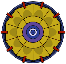 Принцип действия имплозивной схемы подрыва — по периметру делящегося вещества взрываются заряды конвенционального ВВ, которые создают взрывную волну, «сжимающую» вещество в центре и инициирующую цепную реакцию.