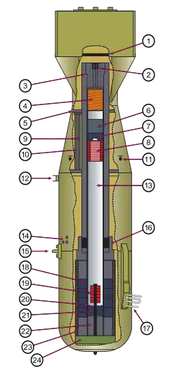 Устройство боеприпаса L-11 «Little Boy»: 1  броневая плита, 2  электрозапалы Марк-15, 3  казённая часть орудийного ствола с заглушкой, 4  мешочки с кордитом, 5  труба усиления ствола, 6  стальной задник снаряда, 7  поддон снаряда из карбида вольфрама, 8  кольца из урана-235, 9  выравнивающий стержень, 10  бронированная труба с электропроводкой, 11  порты барометрических датчиков, 12  электроразъёмы, 13  орудийный ствол калибра 6,5 дюймов, 14  разъёмы предохранителя, 15  такелажная серьга, 16  адаптер мишени, 17  антенны, 18  рукав из карбида вольфрама, 19  мишень из урана-235, 20  полониево-бериллиевые инициаторы, 21  заглушка из карбида вольфрама, 22  наковальня, 23  рукав мишени из стали К-46, 24  носовая заглушка диаметром 15 дюймов