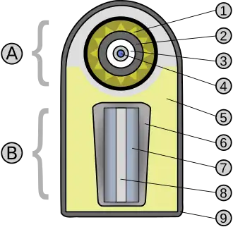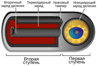 Конструкция термоядерного боеприпаса образца 1950-х годов с цилиндрическим зарядом термоядерного синтеза (в современных конструкциях используются сферические вторичные ступени).
