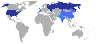 Примечание: Данные по России c 1991 г. и США c 2002 г. включают только боезаряды стратегических носителей; оба государства располагают также значительным количеством тактического ядерного оружия, которое трудно поддаётся оценке[25].