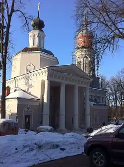 Постройка церкви Иоанна Предтечи, начатая в 1704 году, была завершена в 1709 году: 4 ноября 1709 года были «…выданы два антиминса, по благословенной грамоте в Московский уезд, в село Афинеево, в новопостроенную церковь Иоанна Предтечи, да в предел Алексия Митрополита, Китайского сорока, староста поповской, Николаевский поп Феодор Яковлев взял два антиминса и росписался». В 1779 году новый владелец села, Захар Егорович Волынский, сменил на храме главу и покрыл церковь металлом. Немного позже, в 1780-х годах, церковь была реконструирована в стиле псевдоготики: разобрана колокольня и сооружена новая, которая сохранилась до наших дней. Вместе с колокольней в это же время возвели надстройку апсиды северного придела и высокий четырёхколонный портик. В советское время храм не закрывался.