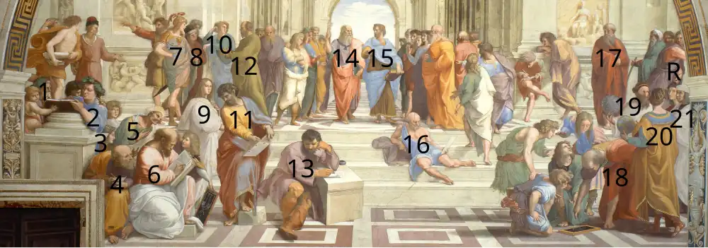 - ↑ The School of Athens, «Who is Who?» Архивная копия от 20 августа 2019 на Wayback Machine, Michael Lahanas, hellenicaworld.com (Дата обращения: 14 октября 2010)