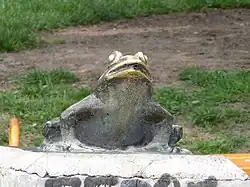 У входа в парк есть фонтан с металлическими лягушками вокруг него.