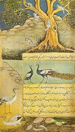 Из животных упомянуты фазаны, соколы, куры, собаки, гуси, лисицы, кабаны, лошади, куланы, верблюды, овцы, олени, зайцы и змеи. Описывая экзотический мир Индостана Бабур называет обезьян и летучих лисиц.