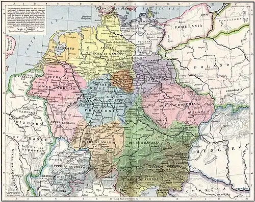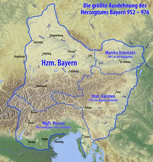 При разделе государства, предпринятом Карлом Великим, Бавария вместе с Италией досталась второму сыну его Пипину, умершему ещё при жизни отца. Людовик Благочестивый, наследовавший Карлу Великому, передал сначала управление своему старшему сыну Лотарю с титулом короля, но при новом разделении 817 г. она перешла к Людовику II, прозванному потом Немецким, который называл себя rex Bojoariorum и избрал своей резиденцией Регенсбург. Людовик непрерывно воевал со славянскими народами, причиняя много вреда своими частыми набегами. Тем временем мало-помалу окрепла светская власть епископов и усилилось могущество пфальцграфов, правивших в качестве наместников. После смерти Людовика Немецкого (876 г.), сын его Карломан сделался королём Баварии, к которой в то время принадлежали ещё Каринтия, Крайна, Истрия, Фриуль, Паннония, Богемия и Моравия.