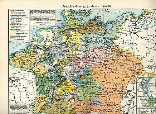 Оба они оказали Реформации, нашедшей многочисленных приверженцев и в Баварии, самое решительное противодействие и в 1541 г. призвали в страну иезуитов. Вильгельм умер в 1550 г. Сын его Альбрехт V Великодушный тоже был другом иезуитов, но вместе с тем покровительствовал наукам и искусствам. Из трёх его сыновей ему наследовал в 1579 г. Вильгельм V Благочестивый, который в 1597 г. вынужден был сеймом передать правление своему старшему сыну Максимилиану I и удалиться в монастырь. Максимилиан I, одарённый редкими способностями, был душой лиги, образовавшейся против протестантской Унии. Во время 30-летней войны император Фердинанд II пожаловал ему (1623 г.) Пфальцское курфюршество и в виде залога на военные издержки передал ему Верхний Пфальц. Вестфальский мир упрочил за Максимилианом I титул пятого избирателя и владение Верхним Пфальцем, вместе с тем учреждено было восьмое курфюршество для Пфальцской линии и за нею утверждено право наследства на Баварию, в случае прекращения потомства Вильгельма. Максимилиан умер 27 сентября 1651 г. после 55-летнего царствования. При его мирном и бережливом преемнике Фердинанде-Марии в последний раз собрался баварский сейм, не отличавшийся многолюдством; с этого времени все права сейма перешли к постоянной сословной комиссии, получившей название сословной управы (Landschafts Verordnung), первоначально избиравшейся только на 9 лет. Фердинанду-Марии наследовал 1679 г. его сын, Максимилиан II Эмануэль, принявший в войне за Испанское наследство сторону Франции. Вследствие этого, после битвы при Гохштедте (1701 г.), император обошёлся с Баварией как с завоёванной страной: Максимилиан был объявлен изменником и лишён своих прав, которые были возвращены ему только по Баденскому миру 1714 г. Ему наследовал в 1726 г. Карл Альбрехт. Основываясь на брачном договоре между герцогом Альбрехтом V и его супругой Анной, дочерью императора Фердинанда I, подкреплённый также завещанием последнего, он предъявил после смерти Карла VI притязания на большую часть Австрийского наследства и начал войну против Марии-Терезии. Вспомоществуемый французской армией, он завоевал всю Верхнюю Австрию, провозгласил себя после завоевания Праги королём богемским и в 1742 г. был избран во Франкфурте в немецкие императоры, под именем Карла VII. Однако на этом торжество его и закончилось. Австрия заняла своими войсками Баварию, и Карл Альбрехт, поспешивший в Мюнхен, скоропостижно умер 20 января 1745 г.