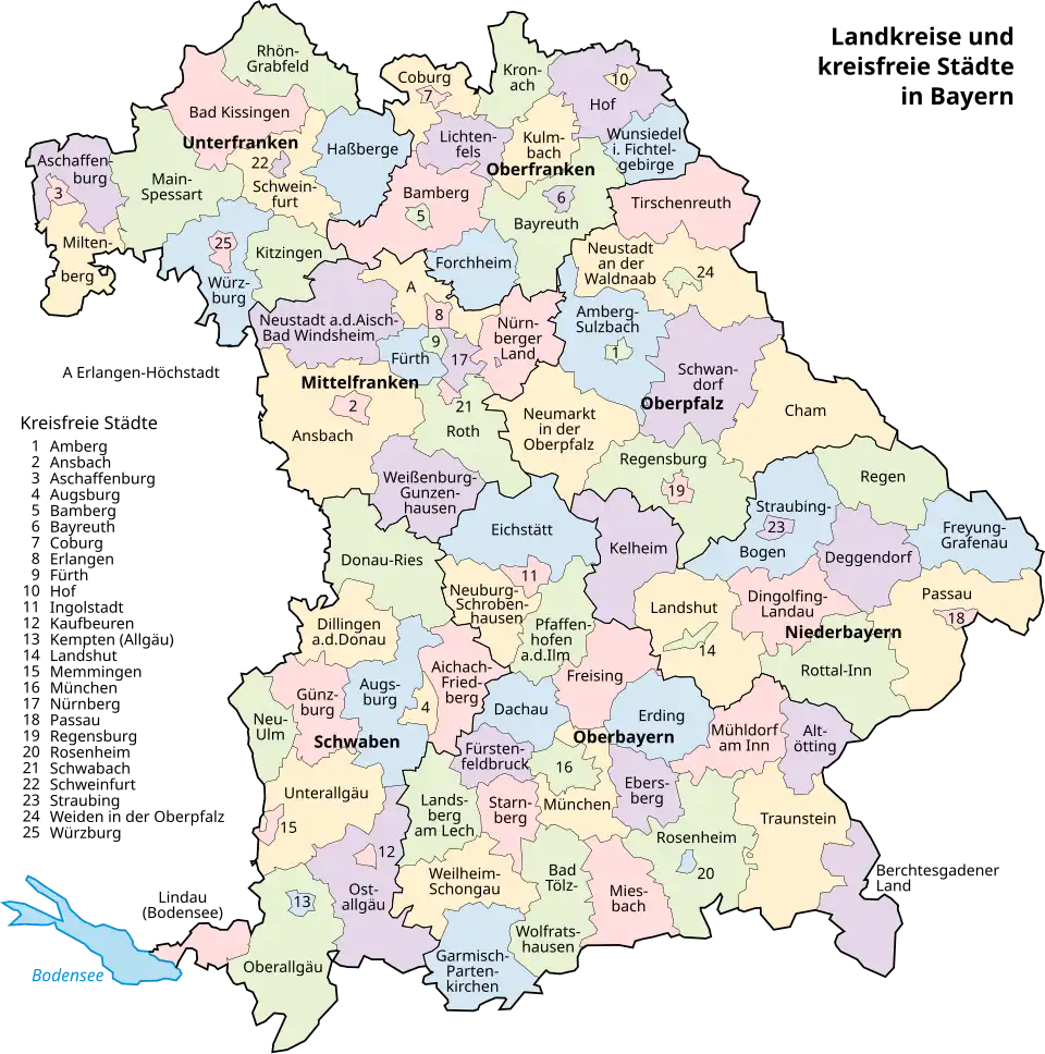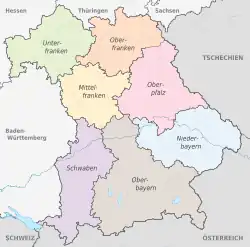 Столица и крупнейший город — Мюнхен. Административно делится на семь округов.