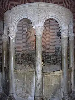 | Конха апсиды базилики (фрески выполнены при реставрации в первой половине XX века) | Епископская кафедра | Киворий для раки с мощами святого Димитрия (расположен в левом нефе базилики) |