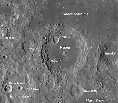 На северо-востоке от кратера находится Море Краевое, на юго-востоке — Море Смита. Ближайшими соседями кратера являются кратер Вильдт на северо-западе; кратер Непер на северо-востоке; кратер Такини на востоке; кратер Шуберт на юге. В чаше кратера расположен кратер Нокс-Шоу[1]. Селенографические координаты центра кратера — 5°17′ с. ш. 80°01′ в. д. / 5,28° с. ш. 80,01° в. д., диаметр — 100 км[2], глубина — 1,68 км[3].