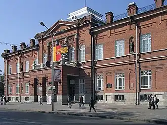 Здание имеет два фасада, в нём соединились два стиля — со стороны улицы Ленина главенствует русский классицизм, а со стороны улицы Пушкина преобладает мусульманский, восточный стиль (удлинённые прорези окон создают оригинальный вид). Входная часть здания решена в виде глубокого балкона-козырька, опирающегося на четыре кирпичные квадратные колонны. Главный фасад на уровне второго этажа имеет четырёхколонный портик и купол со шпилем.