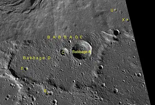 Снимок зонда Lunar Orbiter - IV. В центре кратера видны сателлитные кратеры Бэббидж C (слева) и Бэббидж А (справа). | |
