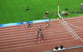 Финиш финального забега на 100 метров на Олимпийских играх 2008 года