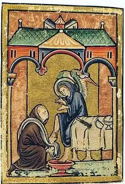 Св. Кутберт омывает ноги ангелу. Миниатюра из рукописи XII века Жития св. Кутберта, написанного Бедой