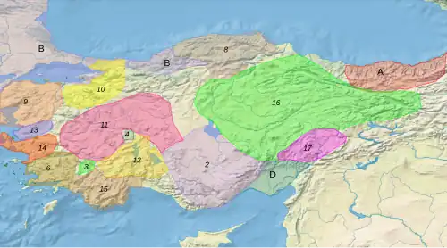 (A) Трапезундская империя  (B) Византийская империя  (D) Киликийская Армения  2. Караманогуллары  3. Инанчогуллары (Ладик)  4. Сахиб-атаогуллары  6. Ментешеогуллары  8. Джандарогуллары  9. Карасыогуллары  10. Османогуллары  11. Гермияногуллары  12. Хамидогуллары  13. Саруханогуллары  14. Айдыногуллары  15. Ментешеогуллары  16. Эретнаогуллары  17. Дулкадирогуллары