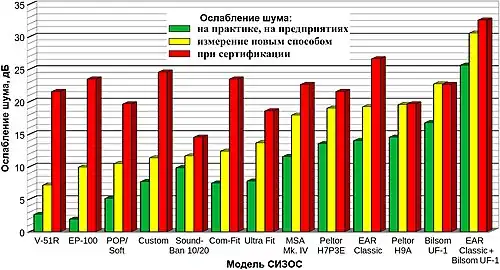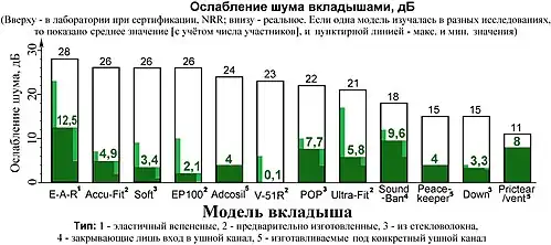 Использование лабораторных результатов для сравнительной оценки эффективности СИЗОС разных типов даст наибольшую ошибку в том, что — в целом — вкладыши (кроме сделанных из эластичного пористого материала) обеспечивают наилучшую защиту. На практике — всё наоборот.