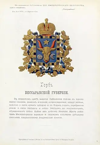 Герб Бессарабской области утверждён Николаем Первым 2 апреля 1826 года: «Щит разделён на две половины, в верхней части в красном поле двуглавый орёл, украшенный золотой короною, на груди коего красный щит с изображением св. Великомученика и Победоносца Георгия, сидящего на белом коне и копьем поражающего змия; орёл держит в правой лапе факел и молнию, а в левой лавровый венок; в нижней половине в золотом поле изображена воловья голова, представляющая герб Молдавии»[14].