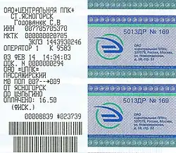 Внешний вид билета на проезд в пригородном электропоезде от станции Ясногорск до станции Шульгино в 2014 году