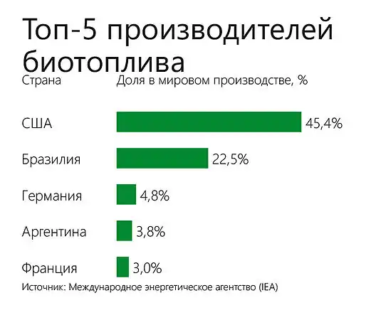 Мировое производство биоэтанола в 2015 году составило 98,3 млрд литров, из которых 30 пришлось на Бразилию и 56,1 — на США. Этанол в Бразилии производится преимущественно из сахарного тростника, а в США — из кукурузы.