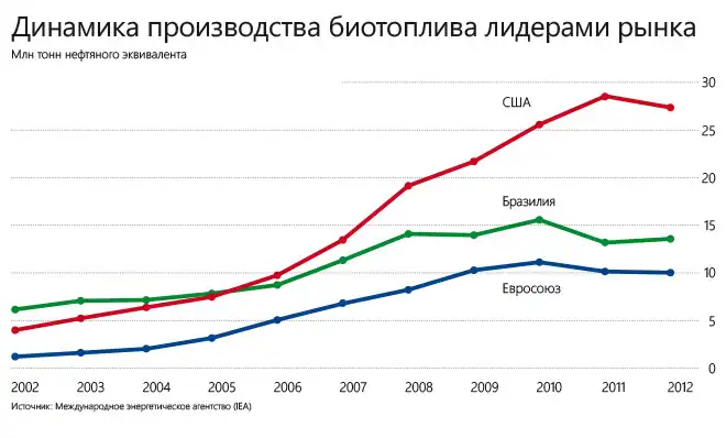 Более трети зерна в США, более половины рапса в Европе, почти половина сахарного тростника в Бразилии идут на производство биотоплива (Bureau et al, 2010)[40].