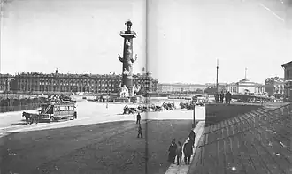 Ростральная колонна, конка и телеги, на стрелке Васильевского острова, фотосъёмка с лестницы здания биржи, 1903 год.