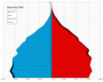 Основные этносы: бирманцы — 68 %, шаны — 9 %, карены — 7 %, араканцы — 4 %, китайцы — 3 %, индийцы — 2 %, моны — 2 %, качины — 1,5 %, другие народности — 3,5 %[19].