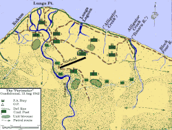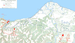 Карта периметра Лунга на Гуадалканале, показаны маршруты подхода японских сил и направления японских атак во время боя. Ока атаковал с запада (слева), батальон «Кума» с востока (справа) и главные силы атаковали «хребет Эдсона» внизу в центре карты
