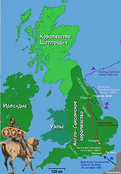 25 декабря 1066 года в Вестминстерском аббатстве состоялась коронация Вильгельма королём Англии. В результате нормандского завоевания было уничтожено древнее англосаксонское государство, на смену которому пришла централизованная феодальная монархия с сильной королевской властью, основанная на европейской рыцарской культуре и вассально-ленной системе. Развитию страны был дан новый толчок, позволивший Англии в короткое время превратиться в одну из сильнейших держав Европы. Земли саксов были конфискованы и розданы воинам армии вторжения[41]. Некоторые из саксов бежали в Византию, где поступили на службу в императорскую гвардию[42].