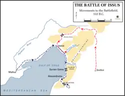 Александр Македонский с войском в 32 тысячи пеших воинов и 4500 всадников переправился в Азию через пролив Геллеспонт в 334 году до н. э. В том же году он разгромил войско персидских сатрапов в сражении на реке Граник, после чего подчинил себе всю Малую Азию и остановился в городе Тарсус. Пока персидский царь Дарий III собирал большую армию, Александр укреплял свой тыл, не рискуя идти во внутренние территории Персидской империи с непокорёнными городами за спиной. В 333 году до н. э. Дарий III собрал войско и направился в Малую Азию, чтобы дать решающее сражение македонянам. Александр, который находился в Малле, узнал, что войско Дария III расположилось в Сохах в нескольких днях пути[4][5]. Через Бейланский проход в Аманских горах македоняне вошли в северную Сирию, однако персов там не обнаружили, так как в это время Дарий III направил своё войско через Аманские ворота в тыл Александру[6]. В данном случае Дарий III проявил себя неплохим стратегом. Он смог перерезать пути между основным войском Александра и Македонией, что в условиях приближающейся зимы могло иметь далеко идущие последствия[7]. Александр, напротив, допустил ошибку не предугадав возможности выбора войском противника другого маршрута, который отрезал его от тыловых баз. Стратегическое решение Дария III было успешным, однако он не успел совершить манёвр на марше македонян, что могло бы привести к разделению их войска на две части[8]. Вследствие манёвра Дария III положение Александра было угрожающим — в случае поражения у него не было пути для отступления. Дарий III, напротив, мог вернуться тем же путём, которым достиг Исса[9].