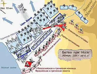 Войско Дария было построено в две линии. В центре располагались, согласно Курцию Руфу, 30 тысяч тяжёловооружённых греческих наёмников и перебежчиков под командованием Тимонда[32][33]. По обе стороны от греческих наёмников находилось 60 тысяч персидских воинов кардаков[34], из которых 20 тысяч поместили слева под командованием Аристомеда. Вероятно, он тренировал персов сражаться в тяжёлом греческом вооружении[35]. Также античные источники упоминают греческих военачальников Бианора и Аминту. Отряды кардаков должны были поддерживать центр войска, которому, по мнению Дария III, предстояло принять основной удар македонской фаланги[28].