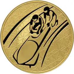 Монета Банка России 2010 г. — Серия: Зимние виды спорта: Бобслей. 200 рублей, реверс.