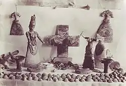 Одежда женщин соответствует изображениям придворных дам на фресках Кносского дворца. Специальным культовым одеянием являются только короткие верхние юбочки-фартуки и головные уборы.