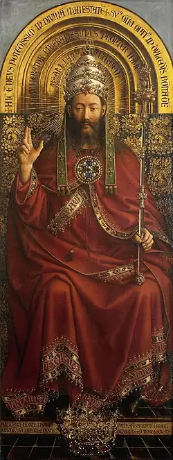 Однако в современных публикациях возобладала интерпретация центрального образа как Бога Отца[129][130]; такой трактовки придерживаются авторы коллективной монографии[91][131] и представители Королевского музея[18]. Так, Барт Франсен замечает, что, хотя неканоничная для христианской иконографии «моложавость» Божественного лика вводит в заблуждение современного зрителя, современникам Мемлинга она могла говорить о том, что в этой фигуре следует видеть единовременное изображение Отца и Сына[131]. Бельгийский историк искусства Пол Ванденбрук (Paul Vandenbroeck) поясняет также, что иконографически изображение Сына с атрибутами Отца может быть способом зрительно представить Господа, Которого не может лицезреть ни один смертный; более того, в интерпретации Мемлинга оно также содержит отсылки к иконографии Троицы[132]. Ванденбрук замечает, что этот образ близок фигуре Бога Отца с центральной створки Гентского алтаря, в которой также слились черты Бога Отца и Сына, однако пояснительная надпись над ней гласит: Hic est Deus — «Се есть Бог»[133][134]. Несомненную параллель между обоими изображениями отмечали и другие историки искусства; видел ли Мемлинг Гентский алтарь собственными глазами или полагался на копии, неизвестно, но во всяком случае он дал образу совершенно иную трактовку, заимствовав лишь отдельные элементы иконографии[126].