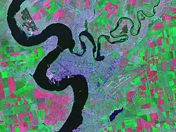 Вид на Николаев из космоса. Справа — Ингул впадает в Южный Буг