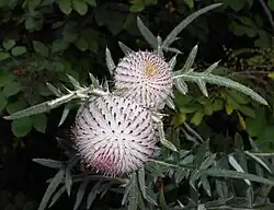 Цветки пурпурные или тёмно-фиолетовые, собраны в шаровидные корзинки диаметром 5–8 см, покрытые густыми серыми паутинистыми волосками. Корзинки вырастают из пазух нескольких листьев. Листья обёртки прямые, ланцетные, кверху расширяющиеся в форме лопаточки, по бокам очень густо покрыты щетинистыми шипами. Они представляют собой переходную форму между стеблевыми листьями и настоящими чешуйками влагалища под ними.