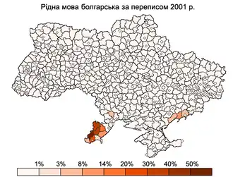 Болгарский язык — один из языков национальных меньшинств Украины. По данным всеукраинской переписи населения, 64,2% украинских болгар назвали родным языком болгарский (в Одесской области — 77,8%, Запорожской — 31,8%)