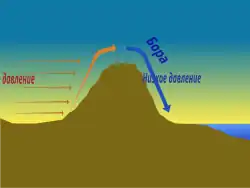 Бора возникает в Новороссийске и на побережье Адриатики в тех случаях, когда холодный атмосферный фронт подходит к прибрежному хребту с северо-востока. Холодный атмосферный фронт сразу же переваливает через невысокий прибрежный хребет. Под воздействием силы гравитации холодный воздух стекает по склону горного хребта, при этом приобретая большую скорость; к барическому градиенту присоединяется сила тяжести холодной воздушной массы, что создаёт большие нисходящие составляющие скорости ветра[4].