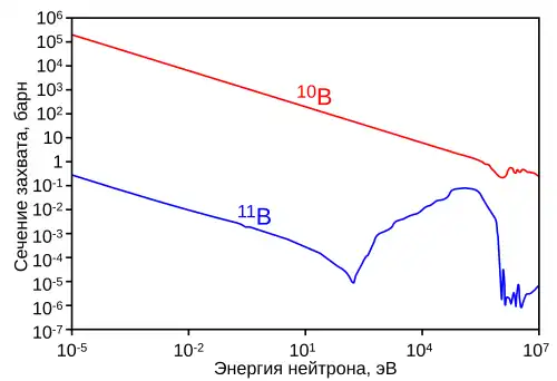 10В имеет очень высокое сечение захвата тепловых нейтронов, равное 3837 барн (для большинства нуклидов это сечение близко к единицам или долям барна), причём при захвате нейтрона образуются два нерадиоактивных ядра (альфа-частица и литий-7), очень быстро тормозящиеся в среде, а проникающая радиация (гамма-кванты) при этом отсутствует, в отличие от аналогичных реакций захвата нейтронов другими нуклидами: