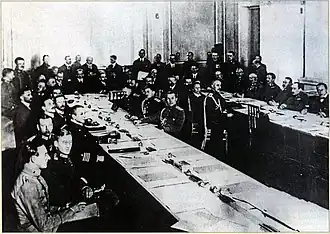 19 ноября (2 декабря) мирная делегация советского правительства, возглавлявшаяся Адольфом Иоффе, прибыла в нейтральную зону и проследовала в Брест-Литовск, в котором располагалась Ставка германского командования на Восточном фронте. Первоначально предполагалось, что в делегацию войдут 15 человек, но в итоге состав был расширен до 28. В качестве уполномоченных — членов ВЦИК — в делегации было 9 человек: сам Иоффе, Лев Каменев, Григорий Сокольников, Анастасия Биценко, Сергей Масловский, матрос Фёдор Олич, солдат Николай Беляков, крестьянин Роман Сташков и московский рабочий Павел Обухов. Ещё 9 составляли «члены военной консультации» из числа офицеров бывшей царской армии во главе с Василием Альтфатером[k 3], а ещё десять человек входили в состав служебного персонала, обозначенного как «состоящие при делегации», во главе с секретарём Львом Караханом[k 4][16][17][18].