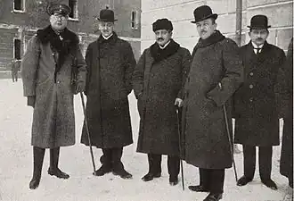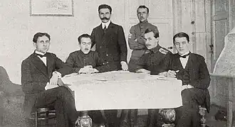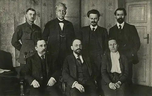 Второй состав советской делегации в Брест-Литовске. Сидят, слева направо: Каменев, Иоффе, Биценко. Стоят, слева направо: Липский, Стучка, Троцкий, Карахан