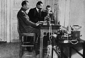 Секретарь советской делегации Л. М. Карахан у телеграфного аппарата в Брест-Литовске