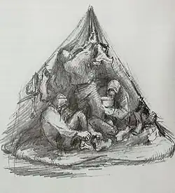 Полярная одежда у офицеров и матросов была одинакова. Поверх шерстяного нижнего белья носили фланелевую рубаху, поверх которой надевался свитер. На ногах носили меховые ботинки с толстой подошвой, закупленные в России. На воздухе обычно носили норвежские сапоги, а в походах и в сильный мороз лапландские каньги из оленьей шкуры, которые англичане называли finnesko. Поверх белья, брюк и свитеров надевали ветрозащитную габардиновую одежду фирмы Burberry. Скотт не считал меховую одежду настоятельно необходимой для полярных широт[80].