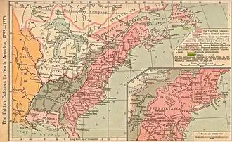 В 1760-е и 1770-е годы отношения метрополии с тринадцатью колониями на американском континенте серьёзно ухудшились. Непосредственным поводом для недовольства колонистов стали попытки британского парламента обложить американских колонистов налогами без их согласия[58]. Но главной причиной было установление полного господства Британской империи на североамериканском континенте. С одной стороны, это поставило её коренных жителей, индейцев, в зависимость от поставок оружия и прочих ремесленных изделий от англичан, в то время как ранее они могли получать эти товары от французов. Не доверяя индейцам, англичане запретили продавать индейцам оружие, что вызвало их восстание. Для умиротворения индейцев британское правительство вынуждено было пойти на уступки и запретить английским колонистам селиться на территориях бывших французских колоний, что также стало причиной недовольства со стороны земельных спекулянтов и фермеров. Кроме того, англичане вынуждены были и по окончании войны с Францией и подавления восстания индейцев содержать в колониях значительный контингент вооружённых сил, для чего колонии и были обложены дополнительными налогами. Колонисты, которые по окончании войны уже не нуждались в английской армии (ведь угроза в лице французов была ликвидирована раз и навсегда), лишь мешавшей их операциям на индейских территориях, восстали против дополнительных налогов и британского военного присутствия.