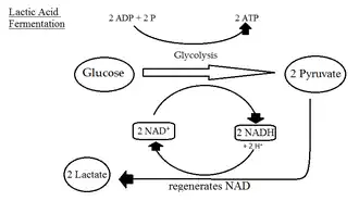 Молочнокислое брожение осуществляют филогенетически неродственные организмы: представители порядков Lactobacillales, Bacillales, а также семейства Bifidobacteriaceae. Эти бактерии живут исключительно за счёт брожения. Молочнокислое брожение подразделяют на гомоферментативное и гетероферментативное. При гомоферментативном молочнокислом брожении сахара сбраживаются через гликолиз и около 90 % конечного продукта приходится на лактат (остальные 10 % составляют ацетат, ацетоин и этанол). Субстратом для гомоферментативного молочнокислого брожения служат лактоза, другие моно- и дисахариды, а также органические кислоты. Общее уравнение гомоферментативного брожения: глюкоза → 2 лактат + 2 АТФ[20].