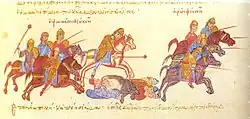 Письменные и изобразительные источники указывают, что в Византии было три основных способа ношения булавы:[49]