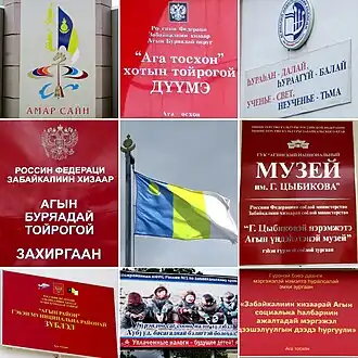 Устав Забайкальского края РФ устанавливает, что «на территории Агинского Бурятского округа наряду с государственным языком[прим. 4] может использоваться бурятский язык»[13].