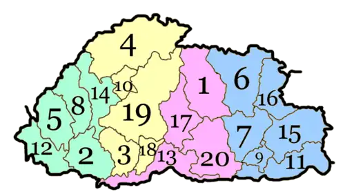 Бутан разделён на четыре дзонгдэя (англ. dzongdey), в состав которых входят 20 дзонгхагов (дзонг-кэ རྫོ་ཁག། , англ. dzongkhag). Каждый дзонгхаг, в свою очередь, делится на гевоги (англ. gewog), которые иногда объединены в дунгхаги (англ. dungkhag).