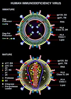 Оболочка вируса состоит из двуслойной липидной мембраны, в которую встроен ряд белков, например трансмембранный гликопротеин gp41 и поверхностный гликопротеин gp120[32]:293-294, 296. Внутри «ядра» вируса, состоящего из матричного белка p17 и капсидного белка p24, находятся две одноцепочечные молекулы геномной РНК и ряд ферментов: обратная транскриптаза, интеграза и протеаза.