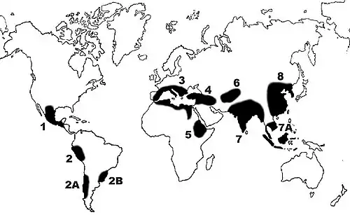 1. Центральноамериканский, 2. Южноамериканский, 3. Средиземноморский, 4. Переднеазиатский, 5. Абиссинский, 6. Среднеазиатский, 7. Индостанский, 7A. Юговосточноазиатский, 8. Восточноазиатский.